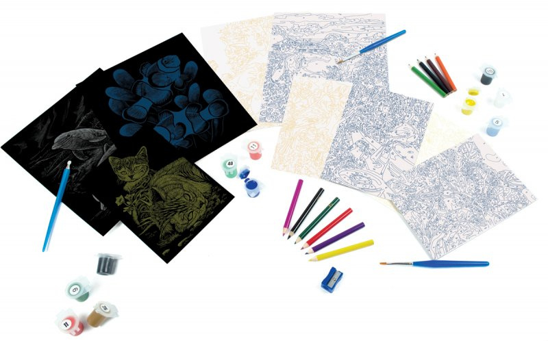 Sada obsahuje- 3x malování podle čísel, 3x škrabací obrázky, 3x malování pastelkami včetně všeho, co k tomu potřebujete- barvy, štětec, škrabák, pastelky apod. Vhodné od 8 let.