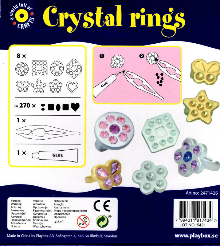 Balení obsahuje 8 druhů prstýnků různých tvarů, 270 ks kamínků různý barev a tvarů, pinzetu a lepidlo.