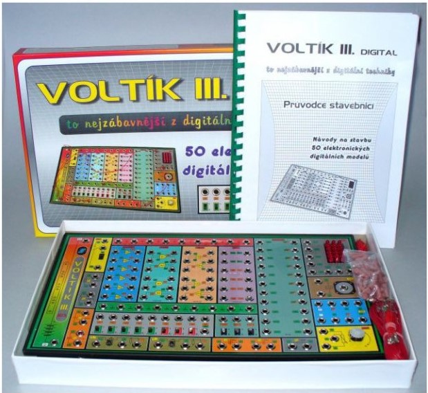 Voltík III. Tato experimentální stavebnice umožňuje sestavit až 50 elektronických digitálních modelů bez pájení. Naprogramujete např. světelného hada, světelný budík nebo nápis, různé bzučáky a blikače a další.