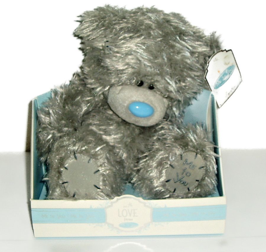 Úžasní šediví plyšáci Me to You s roztomilým modrým nosem a záplatou, čekají na nový domov.