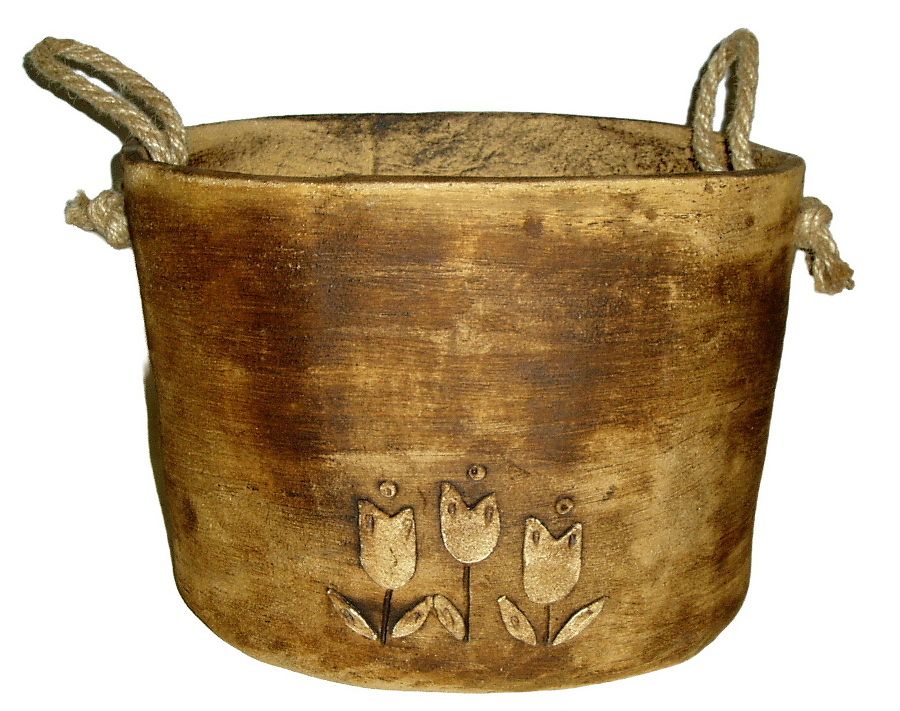 Krásný kameninový květináč s dekorativními uchy z provázku a dekorem tulipánů. Květináč je těžší, takže vítr s ním opravdu nehne a mráz jej nepraskne. Materiál je mrazuvzdorný a velmi odolný. Větší rozměry zajistí maximální komfort každé větší květině. Díky svému neutrálnímu romantickému vzhledu se hodí na každou zahradu nebo před dům, do skalky apod.