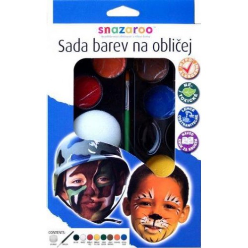 Velká dokonalá sada barev na obličej pro tvoření masek na dětské obličeje. Vytvořte z dětí vojáky, tygra, indiána a další. Barvičky jsou vytvořeny speciálně pro dětskou pokožku, neotírají se a velmi dobře přilnou na dětský obličej. Snadno se omývají a vystačí vám až na 50 obličejů. Sada obsahuje vše potřebné - 8 barev, houbičku a štětec na nanášení barev + obrázkový návod.