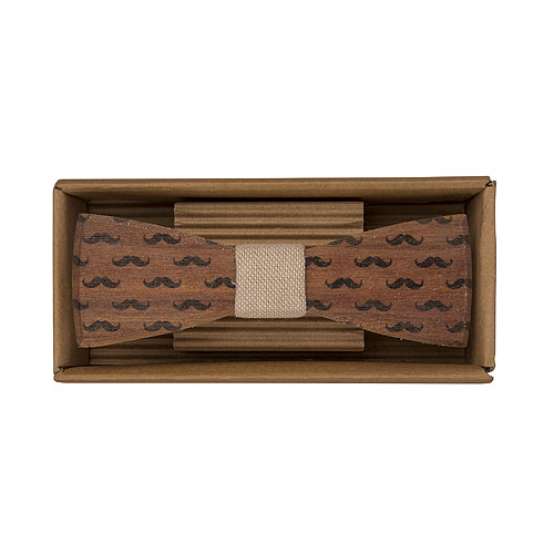 Na dřevěném motýlku je natištěný obrázek kníru.